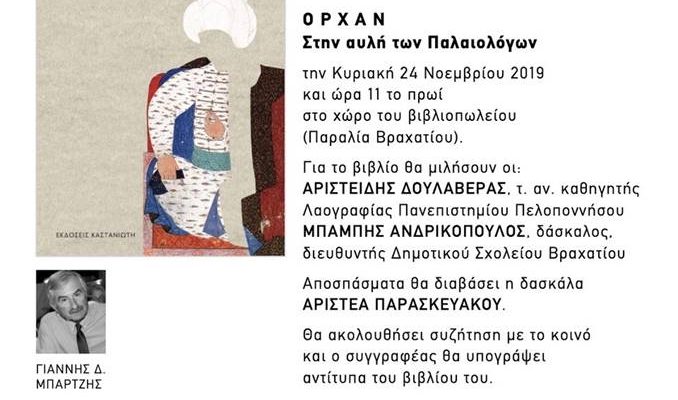 To ιστορικό μυθιστόρημα του Γιάννη Μπάρτζη «Ορχάν, στην Αυλή των Παλαιολόγων» παρουσιάζει το βιβλιοπωλείο Μπιτσάκου και οι εκδόσεις Καστανιώτη στο Βραχάτι.