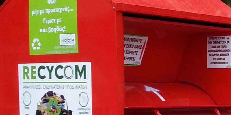 Την πρακτική αυτή επιχειρεί να αλλάξει η εταιρεία RECYCOM, η οποία εφαρμόζει με οργανωμένο, επιστημονικό και επαγγελματικό τρόπο ένα σύστημα ολοκληρωμένης διαχείρισης των μεταχειρισμένων ειδών ένδυσης και υπόδησης. Ο δήμος Κορινθίων αποτελεί τον νέο κρίκο στην αλυσίδα των κόκκινων κάδων της ανακύκλωσης και της αλληλεγγύης.