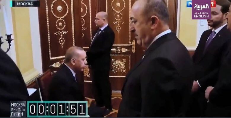 Μετά από δύο λεπτά αναμονής, χρονομετρημένα μάλιστα με το ρολόι στο βίντεο που κυκλοφόρησε, οι πόρτες ανοίγουν και ο Τούρκος πρόεδρος μπαίνει στην αίθουσα που βρίσκεται ο Βλαντιμίρ Πούτιν.