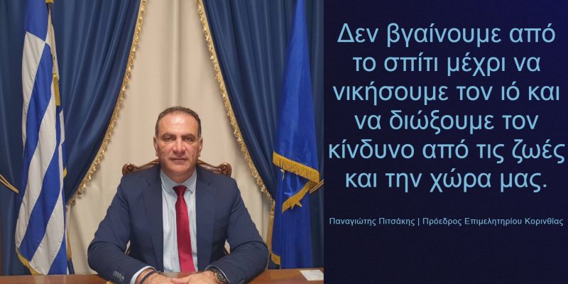 Με μία γραπτή δήλωση ο πρόεδρος του Επιμελητηρίου Κορινθίας Παναγιώτης Πιτσάκης στέλνει ένα μήνυμα συμπαράστασης στα μέλη του Επιμελητηρίου, αλλά και σε όλους τους Κορίνθιους. Στο μήνυμά του ο κ.Πιτσάκης κάνει λόγο για “την μεγαλύτερη απειλή που πρέπει να αντιμετωπίσει η γενιά μας, αλλά και για τον κίνδυνο που βρίσκετε, έξω από την πόρτα του σπιτιού μας και απειλεί, την μητέρα, τον πατέρα μας, ανθρώπους που αγαπούμε και θα είναι δύσκολο για όλους μας αν τους χάσουμε“.