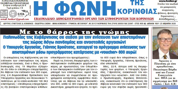 ΕΦΗΜΕΡΙΔΕΣΦΩΝΗ ΤΗΣ ΚΟΡΙΝΘΙΑΣ ΦΩΝΗ ΤΗΣ ΚΟΡΙΝΘΙΑΣ T.1691 23 Απριλίου 2020 By 8eCUgvCwsa 28/April/2020 ShareTweet 0