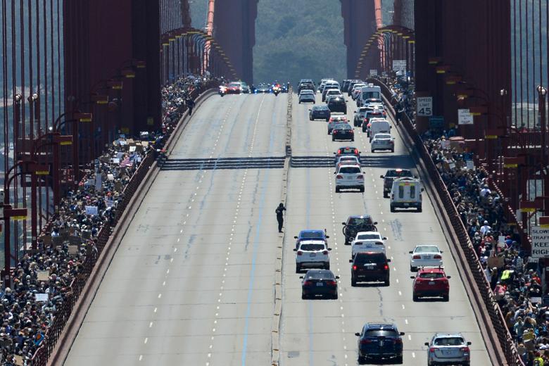 Χιλιάδες διαδηλωτές διαδηλώνουν κατά μήκος της γέφυρας Golden Gate κατά τη διάρκεια διαμαρτυρίας ενάντια στη φυλετική ανισότητα στο Σαν Φρανσίσκο της Καλιφόρνια. Φωτογραφία: Kate Munsch