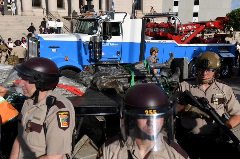 ΚΟΣΜΟΣ Φυγαδεύοντας τον… Χριστόφορο Κολόμβο By 8eCUgvCwsa 11/June/2020 ShareTweet 0 Οι αστυνομικοί στέκονται φρουροί ως υπάλληλοι του Twin Cities Transport and Recovery για να καθαρίσουν και να φυλάξουν το ανατραπέν άγαλμα του Χριστόφορου Κολόμβου στο Καπιτώλιο στο St Paul της Μινεσότα. / Φωτογραφία: Nikola poshis