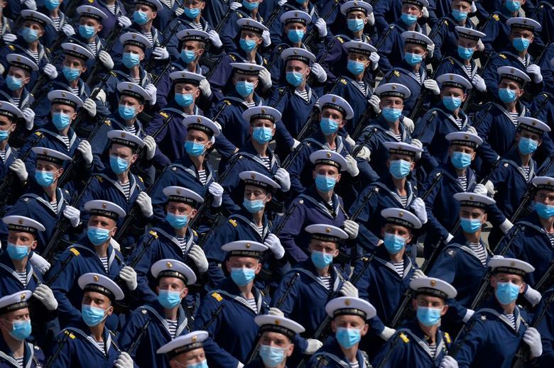 Οι ναύτες του ρωσικού στρατού συμμετέχουν σε μια πρόβα πριν από την αναβολή της παρέλασης νίκης του Β ‘Παγκοσμίου Πολέμου σε μια στρατιωτική βάση στο Αλαμπίνο κοντά στη Μόσχα της Ρωσίας. Φωτογραφία: Υπουργείο Άμυνας της Ρωσίας