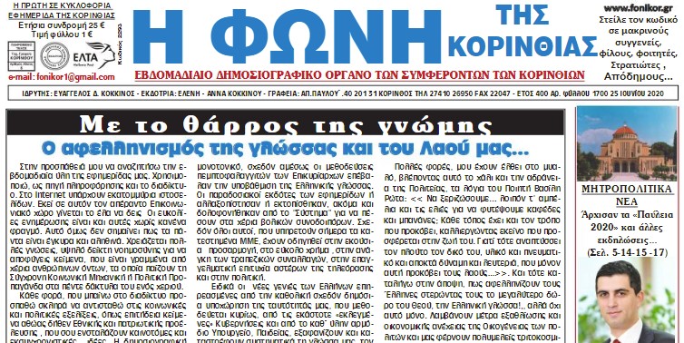 ΕΦΗΜΕΡΙΔΕΣΦΩΝΗ ΤΗΣ ΚΟΡΙΝΘΙΑΣ ΦΩΝΗ ΤΗΣ ΚΟΡΙΝΘΙΑΣ T.1700 25 Ιουνίου 2020 By 8eCUgvCwsa 30/June/2020 ShareTweet 0