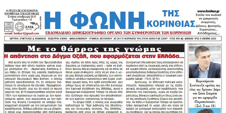 ΕΦΗΜΕΡΙΔΕΣΦΩΝΗ ΤΗΣ ΚΟΡΙΝΘΙΑΣ ΦΩΝΗ ΤΗΣ ΚΟΡΙΝΘΙΑΣ T.1702 9 Ιουλίου 2020 By 8eCUgvCwsa 14/July/2020 ShareTweet 0