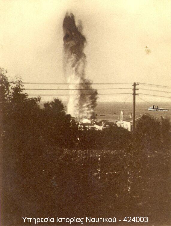 Η στιγμή της έκρηξης μιας εκ των τορπιλών στην προβλήτα του λιμανιού της Τηνου, στις 15 Αυγούστου 1940. Η Έλλη διακρίνεται στην δεξιά πλευρά του στύλου.