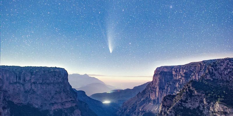 Θέση Μπελόη – σημείο θέασης στο φαράγγι του Βίκου. Χωριό Βραδέτο. Ζαγοροχώρια. Σάββατο 25 Ιουλίου 2020. Ώρα: 22.48. Ο Κωνσταντίνος Εμμανουηλίδης πατάει το κουμπί της φωτογραφικής του μηχανής και απαθανατίζει μια ιστορική στιγμή που θα ξανασυμβεί μετά από 6.800 χρόνια: τον κομήτη Neowise να αφήνει το φωτεινό του αποτύπωμα στον νυκτερινό ουρανό. Τις επόμενες μέρες το στιγμιότυπο θα κάνει τον γύρο του διαδικτύου, αλλά και τον γύρο του πλανήτη μέσα από την ιστοσελίδα της ΝΑSA, που στις 3 Αυγούστου την αναρτά ως τη φωτογραφία της ημέρας. Είναι η υψηλότερη καταξίωση που μπορεί να λάβει ένας αστροφωτογράφος.