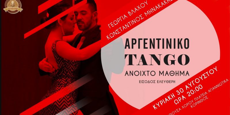 Ο Πολιτιστικός Σύλλογος Κορινθίων η “Τερψιχόρη” σε συνεργασία με τους εξαιρετικούς δασκάλους Κωνσταντίνο Μηνακάκη και Γεωργία Βλάχου διοργανώνει ένα ανοιχτό μάθημα γνωριμίας με την τέχνη του αργεντίνικου Tango.