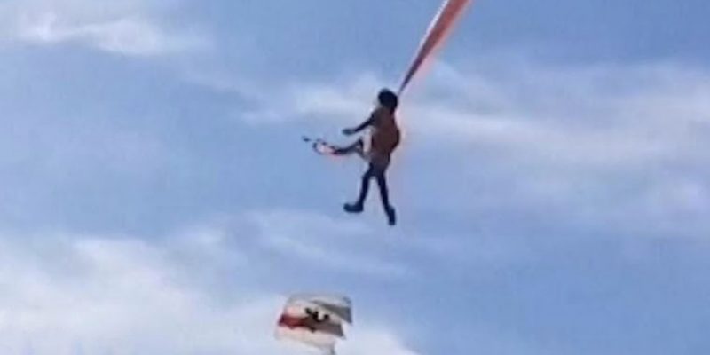 Το βίντεο που κατέγραψε τη σκηνή δείχνει το κορίτσι που βρίσκεται στον αέρα να κάνει αρκετές σβούρες πάνω από ένα πλήθος ενηλίκων που πασχίζουν να τραβήξουν τον χαρταετό στο έδαφος.
