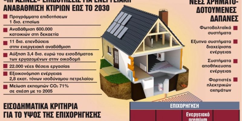 Με προγράμματα-«μαμούθ» της τάξης του 1 δισ. ευρώ τουλάχιστον ετησίως περίπου 600.000 ιδιοκτήτες κατοικιών θα μπορέσουν με επιδοτήσεις να αναβαθμίσουν ενεργειακά τις κατοικίες τους έως το 2030.