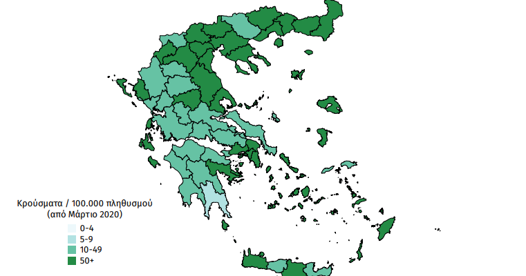 2363 (18.1%) θεωρούνται σχετιζόμενα με ταξίδι από το εξωτερικό και 5649 (43.3%) είναι σχετιζόμενα με ήδη γνωστό κρούσμα.