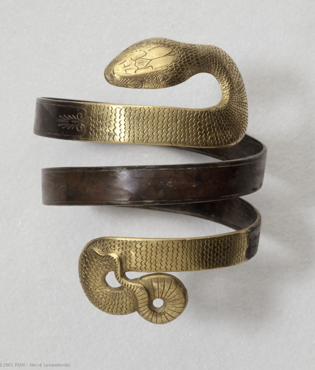 Αυτό το χάλκινο βραχιόλι, που κατασκευάστηκε τον 4ο ή 3ο αιώνα π.Χ. και ανακαλύφθηκε κοντά στην Κόρινθο στη βόρεια Πελοπόννησο, αγοράστηκε από το Λούβρο στα τέλη του 19ου αιώνα. Διαμορφωμένο από μια λεία, επίπεδη λωρίδα στριμμένη σε σπείρα, τα άκρα της, σε σχήμα κεφαλής και ουράς ενός φιδιού, έγιναν χωριστά, μετά επιχρυσώθηκαν και συγκολλήθηκαν στο κεντρικό τμήμα του βραχιολιού. Οι κλίμακες του ερπετού είναι χαραγμένες στο σώμα του, με μεγάλη φυσιοκρατία και προσοχή στη λεπτομέρεια. Μια προτομή από την Κυρήνη, που εμφανίζεται με τη συλλογή ελληνικών μαρμάρων του Λούβρου, αντιπροσωπεύει μια νεαρή νεκρή γυναίκα που φορά παρόμοιο βραχιόλι στον αριστερό της καρπό. Τα φίδια συσχετίζονταν συνήθως με τον κάτω κόσμο και η παρουσία του αποτελεί ένδειξη για το σκοπό της φιγούρας ως ταφικό αντικείμενο. Βραχιόλια αυτού του τύπου κατασκευάστηκαν στον ελληνικό κόσμο από τα πρώτα χρόνια.