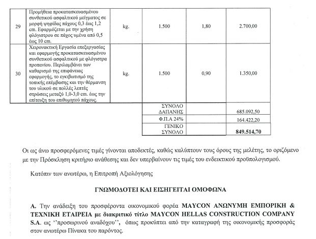 Πιο αναλυτικά, στη σύμβαση που αφορά τα χρώματα και τη σήμανση, το κόστος ανήλθε (μαζί με το ΦΠΑ) στα 849.514,70 ευρώ και το έργο ανέλαβε η “MAYCON Ανώνυμη Εμπορική και Τεχνική Εταιρεία”. Μεταξύ άλλων, περιελάμβανε τα χρώματα του οδοστρώματος, (κίτρινο και πράσινο για τις λωρίδες του ποδηλατόδρομου και του πεζόδρομου) το οποίο μόλις τρεις μήνες μετά έχει αλλοιωθεί. Επίσης, περιελάμβανε προκατασκευασμένα θερμοπλαστικά σήματα ΚΟΚ, βέλη κατεύθυνσης, πλευρικές πληροφοριακές πινακίδες οδικής σήμανσης, στύλους πινακίδων, το κόστος της χειρονακτικής εργασίας κ.α.