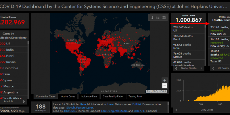 Τα ξημερώματα της 29ης Σεπτεμβρίου το Center for Systems Science and Engineering (CSSE) του πανεπιστημίου Johns Hopkins κατέγραψε ένα εκατομμύριο νεκρούς από τον covid. Χρειάστηκαν ακριβώς οκτώ μήνες, καθώς το πανεπιστήμιο άρχισε να καταγράφει τα θύματα από τις 28 Ιανουαρίου.