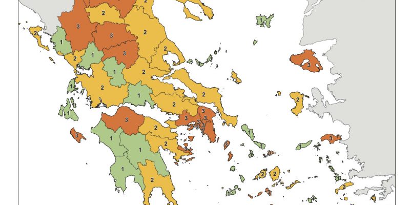 Ο χάρτης περιλαμβάνει τέσσερα επίπεδα προληπτικών μέτρων και κανόνων για κάθε περιφερειακή ενότητα της χώρας