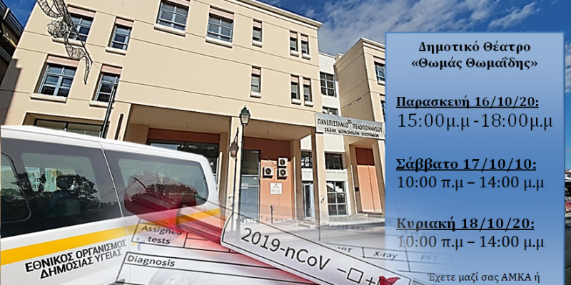 Στα πλαίσια ελέγχου και πρόληψης του Covid-19 ο Δήμαρχος Κορινθίων Βασίλης Νανόπουλος, μετά από σχετική συνεννόηση, παραχώρησε σε κλιμάκιο του ΕΟΔΥ χώρο στο Δημοτικό Θέατρο Κορίνθου, προκειμένου να πραγματοποιηθούν διαγνωστικά test covid-19 σε πολίτες που το επιθυμούν.