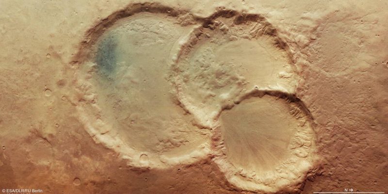 Το σκάφος Mars Express του Ευρωπαϊκού Οργανισμού Διαστήματος (ESA), το οποίο βρίσκεται σε τροχιά γύρω από τον γειτονικό πλανήτη εδώ και χρόνια, ανακάλυψε ένα εντυπωσιακό ασυνήθιστο τριπλό κρατήρα. Στην πραγματικότητα πρόκειται για τρεις κρατήρες που εν μέρει αλληλεπικαλύπτονται.