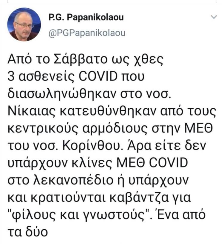 Έτσι πλέον τρεις ασθενείς με covid οι οποίοι χρειάζονταν περίθαλψη σε Μονάδα Εντατικής Θεραπείας μεταφέρθηκαν στο Νοσοκομείο Κορίνθου από το Νοσοκομείο της Νίκαιας, όπως αποκάλυψε ο γραμματέας της Ομοσπονδίας Ενώσεων Νοσοκομειακών Γιατρών Ελλάδος και επιβεβαίωσε το Korinthia.net.gr.