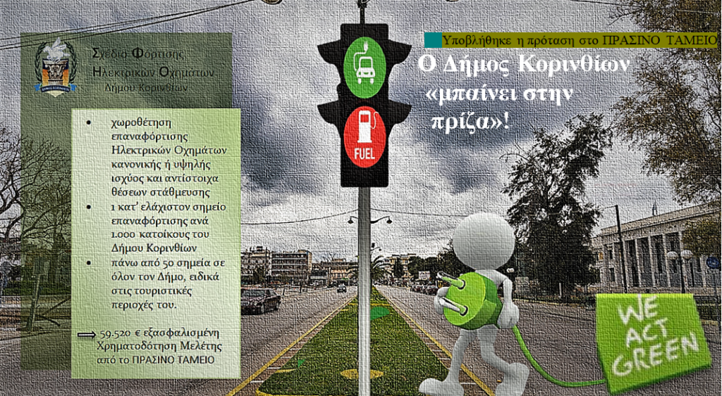 Την πρόταση του για Σχέδιο Φόρτισης Ηλεκτρικών Οχημάτων (ΣΦΗΟ) υπέβαλλε ο Δήμος Κορινθίων στο Πράσινο Ταμείο ανταποκρινόμενος στην «πρόκληση» της ηλεκτροκίνησης, ενός περιβαλλοντικά ορθού τρόπου μετακίνησης με οφέλη αυταπόδεικτα.