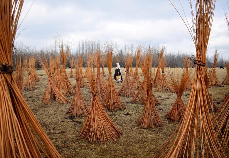 Μια γυναίκα του Κασμίρ περπατάει ανάμεσα σε δέσμες κλαδιών που χρησιμοποιούνται για την κατασκευή “Kangris”, παραδοσιακά σκεύη από πηλό και κλαδιά στα οποία διατηρείται ζεστό φαγητό, σε ένα χωράφι στο χωριό Shallabugh στην περιοχή Ganderbal. Φωτογραφία: Sanna Irshad Matto