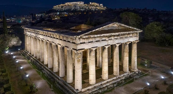 Ο ναός του Ηφαίστου στην Αρχαία Αγορά των Αθηνών και το μνημείο του Φιλοπάππου, δύο σημαντικά τοπόσημα της πόλης που «συνομιλούν» με τον Ιερό Βράχο της Ακρόπολης, εκπέμπουν φως αναγέννησης και ανανέωσης, στέλνοντας ένα μήνυμα ελπίδας για το αύριο.