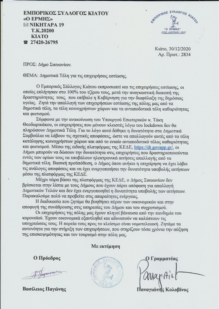 Την απογοήτευσή του για το γεγονός πως η διοίκηση του δ. Σικυωνίων δεν έχει ενεργοποιήσει τις αιτήσεις απαλλαγής των τελών και των κοινοχρήστων χώρων για τις επιχειρήσεις εστίασης εκφράζει με ανακοίνωσή του ο Εμπορικός Σύλλογος Κιάτου.