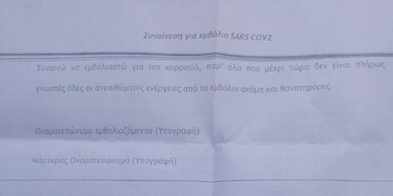 «Απίθανα πράγματα συμβαίνουν με τον εμβολιασμό του υγειονομικού προσωπικού» κατήγγειλε ο πρόεδρος της ΠΟΕΔΗΝ δίνοντας στη δημοσιότητα φωτογραφία του επίμαχου εντύπου. Όπως διακρίνεται, το έντυπο δεν περιλαμβάνει καμία σφραγίδα ή υπογραφή για το ποιος ζητεί τη συναίνεση – αν για παράδειγμα είναι πρωτοβουλία του νοσοκομείου ή της αρμόδιας ΥΠΕ – ενώ έχει τυπογραφικά λάθη και είναι ξεκάθαρα προχειροφτιαγμένο.