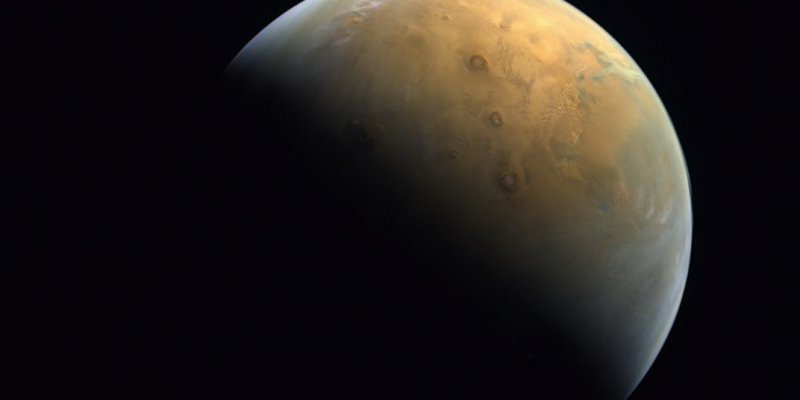 «Η αποστολή των Εμιράτων συνέλαβε την εικόνα του μεγαλύτερου ηφαιστείου του ηλιακού συστήματός μας, του Όρους Όλυμπος, να αναδύεται στο φως το ήλιου, νωρίς το πρωί», ανέφερε η διαστημική υπηρεσία των ΗΠΑ.