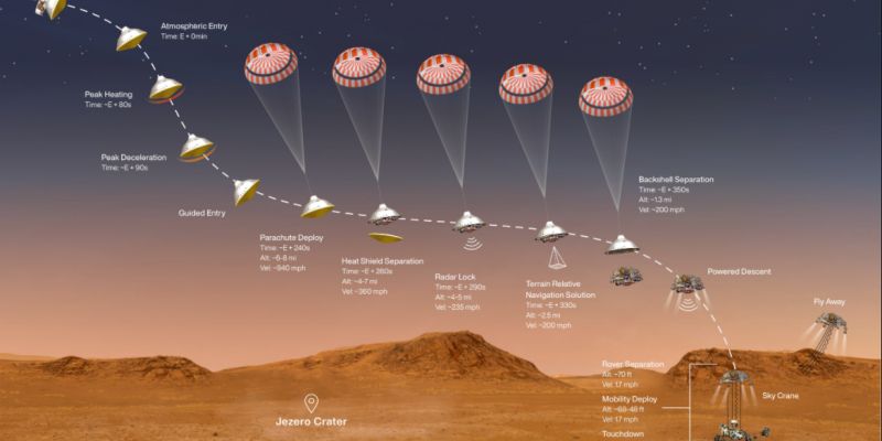 Επτά μήνες μετά την εκτόξευσή του, το Perseverance θα εισέλθει στην ατμόσφαιρα του Άρη για τα επονομαζόμενα “7 λεπτά του τρόμου” μέχρι να προσεδαφιστεί. Η θερμική ασπίδα του σκάφους θα αναπτύξει θερμοκρασίες έως και 1.300 βαθμών Κελσίου από την τριβή, η οποία θα το επιβραδύνει από την ταχύτητα των 9.000km/h σε 1.500km/h. Έπειτα θα ανοίξει το υπερηχητικό αερόστατο το οποίο θα επιβραδύνει ακόμα περισσότερο το σκάφος στα 320km/h. Η θερμική ασπίδα θα πέσει και το Sky Crane θα χρησιμοποιήσει τους εκτοξευτήρες του για να οδηγήσει το rover στο σημείο προσεδάφισης, όπου θα το χαμηλώσει με συρματόσχοινα στο έδαφος πριν να απομακρυνθεί από το σημείο.