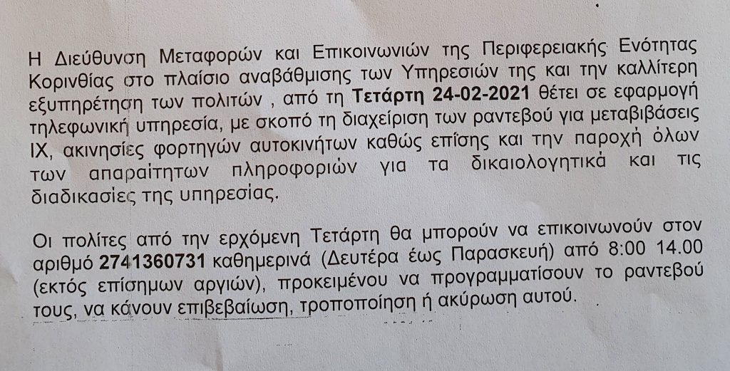 Μόνο με τηλεφωνικά ραντεβού από αύριο η εξυπηρέτηση στη Διεύθυνση Μεταφορών και Επικοινωνιών Π.Ε. Κορινθίας για μεταβιβάσεις ΙΧ.