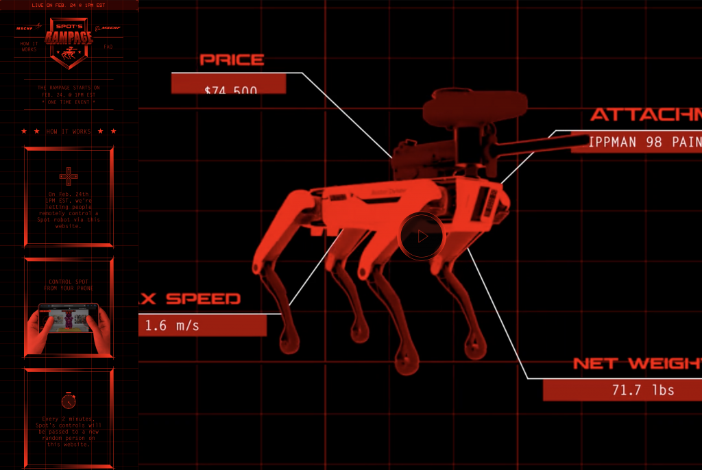 Η ομάδα MSCHF που είναι πίσω από το project, υποστηρίζει στον αντίλογο πως ο Spot και όλα τα ρομπότ σαν αυτόν, θα χρησιμοποιηθούν ούτως ή άλλως σε στρατιωτικές χρήσεις. Το project ονομάζεται εύστοχα “Spot’s Rampage” και επιτρέπει τον έλεγχο του Spot από χρήστες, οι οποίοι θα αλλάζουν κάθε δύο λεπτά.