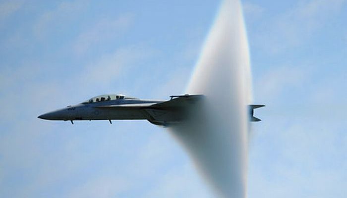 Στην φωτό βλέπουμε το αεροσκάφος την στιγμή που σπάει το φράγμα του ήχου (1.235 km/h.), στην ατμόσφαιρα δημιουργείται μια ταλάντωση που μοιάζει με γιγάντιο ηχείο
