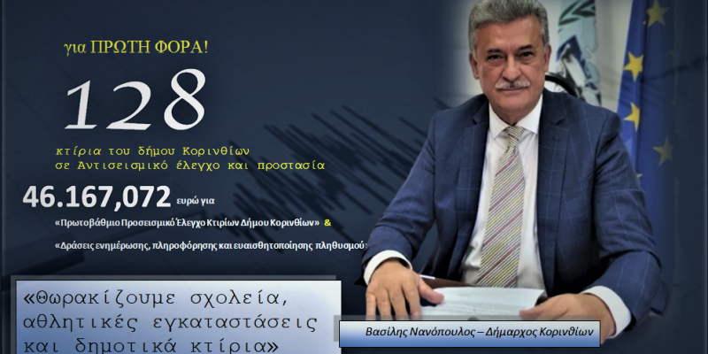 Στον αντισεισμικό έλεγχο και την προστασία όλων των σχολικών μονάδων, όλων των αθλητικών εγκαταστάσεων και όλων των δημοτικών κτιρίων του προχωρά για πρώτη φορά ο Δήμος Κορινθίων. Η νέα δημοτική αρχή έχοντας εντοπίσει το σημαντικό έλλειμμα Ολοκληρωμένου Προγράμματος Πρωτοβάθμιου Προσεισμικού Ελέγχου Κρίσιμων δημοτικών υποδομών (όπως χαρακτηρίζονται τα σχολεία, τα δημοτικά κτήρια και εγκαταστάσεις), ειδικά για μια περιοχή που είναι χαρακτηρισμένη ως σεισμογενής, υποβάλλει πρόταση στο «Αντώνης Τρίτσης» για προσεισμικό έλεγχο 128 συνολικά κτιρίων και δράσεις ενημέρωσης και πληροφόρησης πληθυσμού.