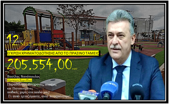 «Τα παιδιά μας αξίζουν ασφαλείς, σύγχρονες και πιστοποιημένες παιδικές χαρές. Γι αυτό εργαζόμαστε, αυτό πετυχαίνουμε» δήλωσε ο Δήμαρχος Κορινθίων Βασίλης Νανόπουλος. «Για την νέα χρηματοδότηση που αφορά την δημιουργία 11 νέων παιδικών χαρών και την αναβάθμιση μιας υφιστάμενης θέλω να ευχαριστήσω όσους εργάστηκαν ώστε με αρτιότητα να υποβληθεί ο φάκελος στο Πράσινο Ταμείο και να εγκριθεί.