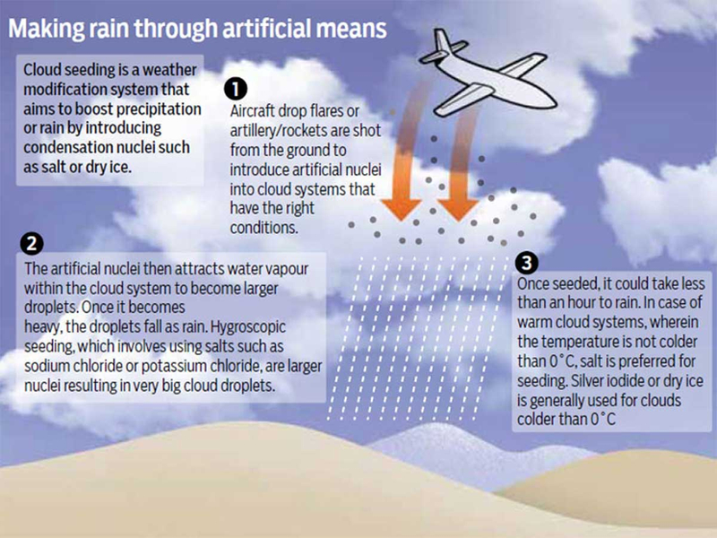 Η χώρα ήδη χρησιμοποιεί τεχνολογία σποράς νέφους, ρίχνοντας αλάτι για να υποβοηθήσει τη βροχή, ωστόσο με μόλις 100 χιλιοστά βροχής το χρόνο, τα ΗΑΕ θέλουν να παράγουν περισσότερη και για αυτό το λόγο διέθεσαν $15 εκατομμύρια για 9 διαφορετικά projects βροχόπτωσης το 2017.