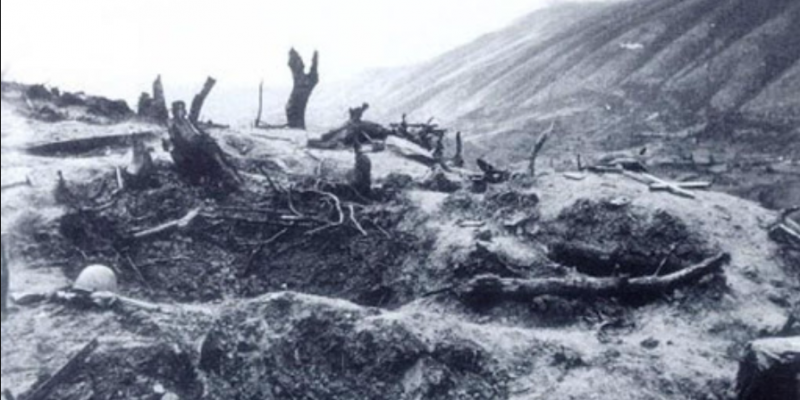 (Στην εικόνα: Φωτογραφία του υψώματος 731 με το πέρας των μαχών. Η ένταση του βομβαρδισμού ήταν τέτοια που το ύψωμα είχε κοντύνει κατά 5 μέτρα μετονομαζόμενο σε 726.)