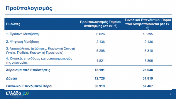 - Μετάβαση σε νέο ενεργειακό μοντέλο φιλικό στο περιβάλλον (Προϋπολογισμός Ταμείου Ανάκαμψης 1,2 δισ. ευρώ – Επενδυτικοί Πόροι που Κινητοποιούνται 2,57 δισ. ευρώ).