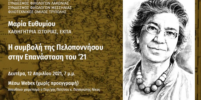 Υπό την αιγίδα της Περιφέρειας Πελοποννήσου, οι Σύνδεσμοι Φιλολόγων Αργολίδας, Κορινθίας, Λακωνίας, Μεσσηνίας και ο Φιλοτεχνικός Όμιλος Τρίπολης συνδιοργανώνουν μέσω διαδικτύου διάλεξη της κ. Μαρίας Ευθυμίου, Καθηγήτριας του Πανεπιστημίου Αθηνών με τίτλο «Η συμβολή της Πελοποννήσου στην Επανάσταση».