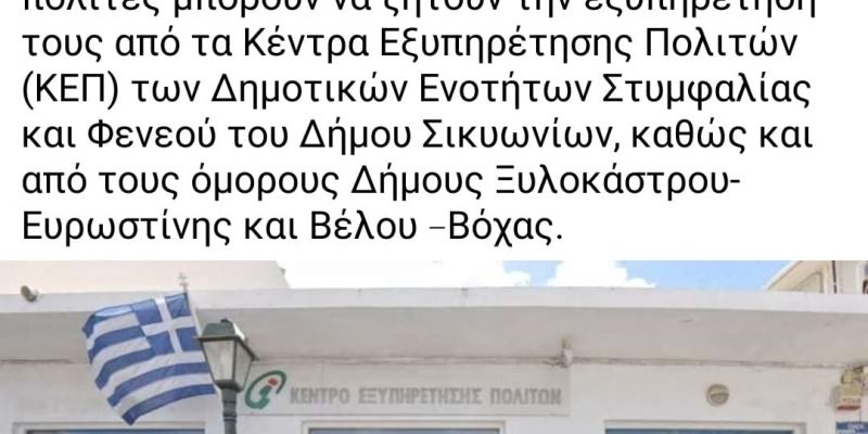 “Ο δήμος Σικυωνίων ανακοίνωσε ότι το ΚΕΠ στο Κιάτο θα παραμείνει κλειστό μέχρι τις 17 Απριλίου, λόγω κορονοϊού. Όσοι πολίτες θέλουν να εξυπηρετηθούν, αναφέρεται στην ανακοίνωση μπορούν να απευθύνονται σε άλλα ΚΕΠ. Στον Φενεό, στην Στυμφαλία, στο Ξυλόκαστρο και στο Βέλο!
