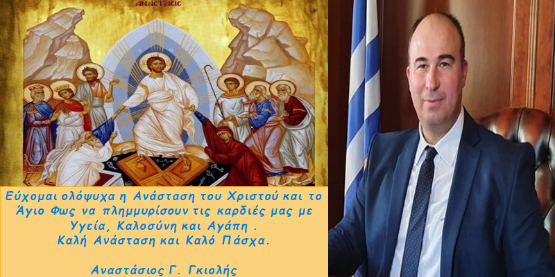 Tις δικές του ευχές για το Πάσχα 2021 έστειλε στις Κορίνθιες και τους Κορίνθιους ο αντιπεριφεριεάρχης Τάσος Γκιολής: Εύχομαι ολόψυχα η Ανάσταση του Χριστού και το Άγιο Φως να πλημμυρίσουν τις καρδιές μας με Υγεία, καλοσύνη και Αγάπη. Καλή ανάσταση και Καλό Πάσχα