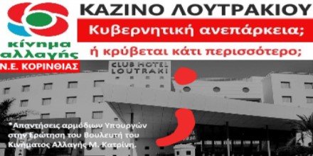 “Εμφανής η κυβερνητική ανεπάρκεια τόσο στις αντιδράσεις όσο και στις απαντήσεις ή τις υπεκφυγές των αρμόδιων Υπουργών στην Ερώτηση που κατέθεσε ο Κοινοβουλευτικός Εκπρόσωπος και τομεάρχης Ανάπτυξης και Επενδύσεων του Κινήματος Αλλαγής Μιχάλης Κατρίνης αναφορικά με το Καζίνο Λουτρακίου“. Αυτό επισημαίνεται σε δελτίο Τύπου που εκδόθηκε από το ΚΙΝΑΛ και αφορά τις τελευταίες εξελίξεις με την μεγάλη κορινθιακή επιχείρηση