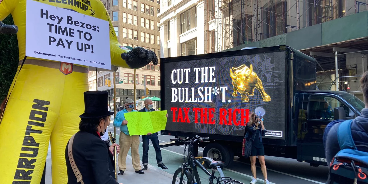 Το θέαμα στη Νέα Υόρκη και την Ουάσιγκτον ήταν αν μη τι άλλο ασυνήθιστο: μια ομάδα εκατομμυριούχων να διαδηλώνει μπροστά από σπίτια ιδιοκτησίας του Τζεφ Μπέζος, του πλουσιότερου ανθρώπου στον πλανήτη υπέρ της μεγαλύτερης φορολόγησης των πλουσίων!