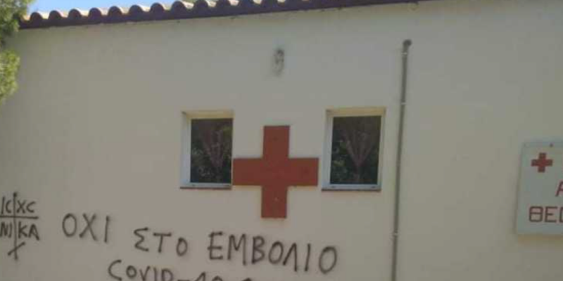 Συνθήματα κατά των Εμβολιασμών έγραψαν Επανω στο τοίχο των γραφείων του Ελληνικού Ερυθρού Σταυρού στο παράρτημα των Αγίων Θεοδώρων Κορινθίας, την Παρασκευή 28 Μαϊου. Οι αντιρρησίες δεν έδειξαν ίχνος σεβασμού προς τον Ερυθρό Σταυρό και το κοινωνικό έργο που επιτελεί προς το κοινωνικό σύνολο. Επέλεξαν να διαμαρτυρηθούν με αυτό το τρόπο γράφοντας πως το εμβόλιο είναι παγίδα θανάτου.