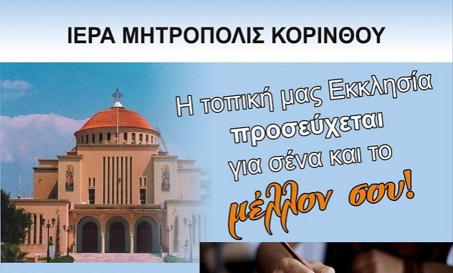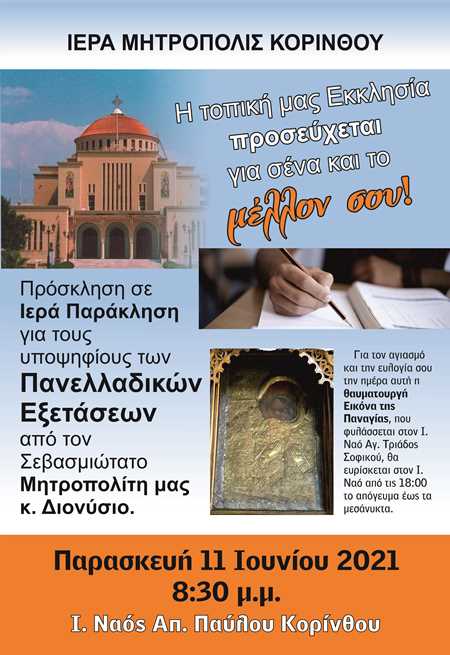 Ανακοινώνεται ότι ο Σεβασμιώτατος Μητροπολίτης μας κ. Διονύσιος θα τελέσει Ιερά Παράκληση για τους υποψηφίους Μαθητές των Πανελλαδικών Εξετάσεων, στον Καθεδρικό Ιερό Ναό του Αποστόλου Παύλου Κορίνθου, την Παρασκευή 11 Ιουνίου 2021 και ώρα 20:30, πλαισιούμενος υπό των Ιερέων των πόλεων Κορίνθου, Λουτρακίου, Αγίων Θεοδώρων, Ισθμίας, Καλαμακίου, Αρχαίας Κορίνθου και Λεχαίου.