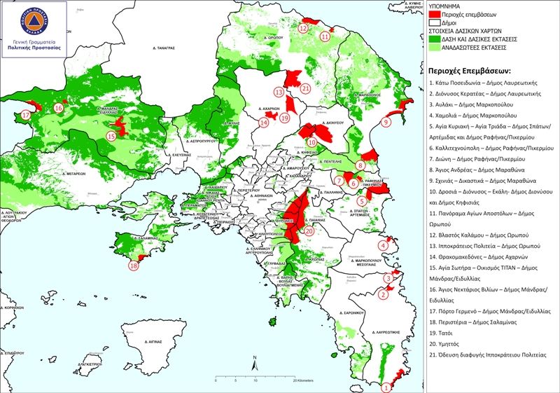 H επιχείρηση αφορά σε εργασίες καθαρισμών, απομάκρυνση εύφλεκτης ύλης, καθώς και διάνοιξης και συντήρησης δρόμων πρόσβασης για τα οχήματα πυρόσβεσης σε 18 περιοχές της Αττικής: Κάτω Ποσειδωνία και Διόνυσος Κερατέας του Δήμου Λαυρεωτικής, Αυλάκι και Χαμολιά του Δήμου Μαρκοπούλου, Αγία Κυριακή- Αγία Τριάδα του Δήμου Σπάτων/Αρτέμιδας και του Δήμου Ραφήνας/Πικερμίου, όπως και Διώνη, Καλλιτεχνούπολη του Δήμου Ραφήνας/Πικερμίου, Άγιος Ανδρέας και Σχοινιάς- Δικαστικά του Δήμου Μαραθώνα, Δροσιά- Διόνυσος- Εκάλη του Δήμου Διονύσου και Δήμου Κηφισιάς, Πανόραμα Αγίων Αποστόλων, Βλαστός Καλάμου, Ιπποκράτειος Πολιτεία του Δήμου Ωρωπού, Θρακομακεδόνες του Δήμου Αχαρνών, Αγία Σωτηρία, Οικισμός ΤΙΤΑΝ, Πόρτο Γερμενό και Άγιος Νεκτάριος Βιλίων του Δήμου Μάνδρας/Ειδυλλίας, καθώς και Περιστέρια του Δήμου Σαλαμίνας. Σε αυτές προστέθηκαν τρεις νέες περιοχές εντός Αττικής: το Τατόι, (είχε να καθαριστεί 20 χρόνια είπε ο κ. Χαρδαλιάς), ο Υμηττός και η Ιπποκράτειος Πολιτεία και άλλες τρεις στην υπόλοιπη Ελλάδα, (στο Σέιχ Σου, στην Αρχαία Ολυμπία και σε συνεργασία με την περιφέρεια στην Χαλκιδική).
