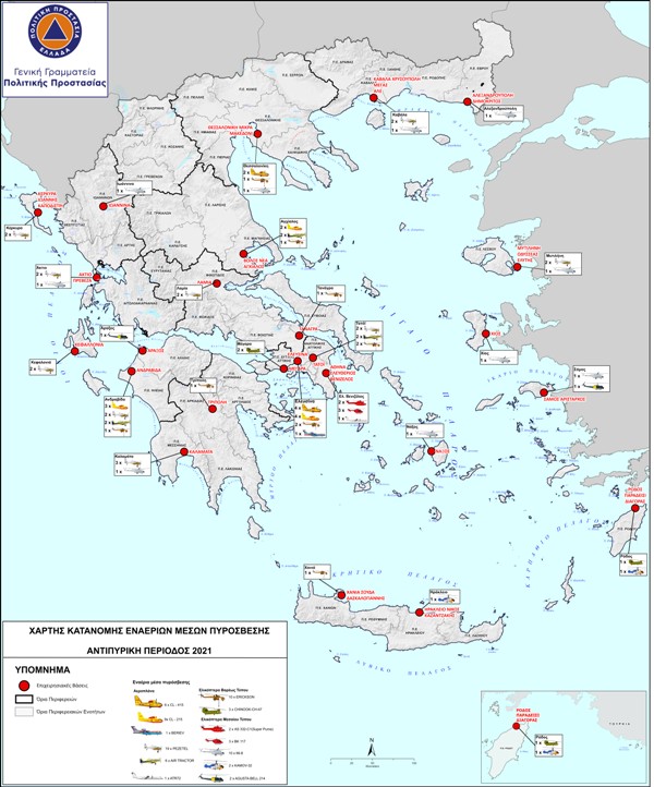 Για το λόγο αυτό ενισχύθηκε φέτος ο στόλος σε σχέση με πέρσι, αριθμώντας συνολικά 69 ελικόπτερα και αεροσκάφη. Τα εναέρια μέσα κατανέμονται σε 25 βάσεις που καλύπτουν το σύνολο της επικράτειας ενώ για πρώτη φορά φέτος εδρεύει στη Θεσσαλονίκη ένα ελικόπτερο βαρέως τύπου (Etickson) το οποίο θα ενισχύει την επιχειρησιακή δυνατότητα στη Βόρεια Ελλάδα.