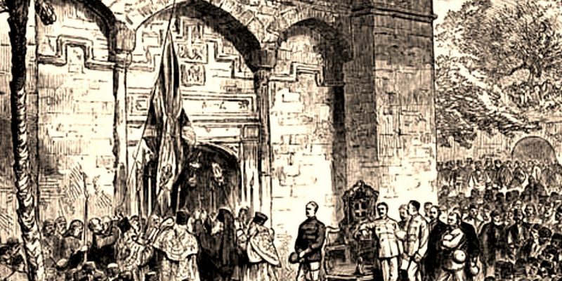 O Βρετανός πρωθυπουργός Μπέντζαμιν Ντισραέλι με τη βοήθεια της Κύπρου, αποκαθιστούν τον Σουλτάνο στη θέση του, γελοιογραφία της εποχής στο περιοδικό Punch.