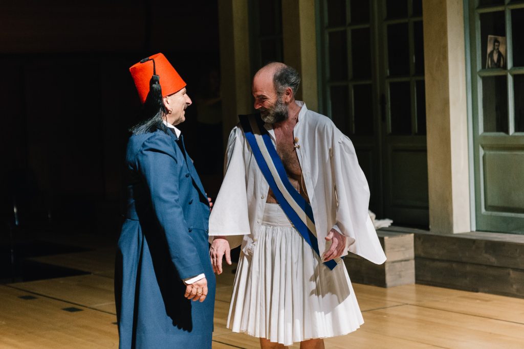 Όλα ζητούν απελευθέρωση, αλλά το σύνθημα θα το δώσουν οι δύο στρατηγοί: ο Μιχάηλ Μαρμαρινός που περιφέρεται με τσαρούχια και μάσκα που γράφει «I love Greece» κι ο Ακύλλας Καραζήσης που φορά μπλε φέσι και μπλε κάπα. Από το ταμπλό λείπουν μόνο οι ζωντανοί συμμετέχοντες, δηλαδή οι θεατές, αλλά αυτή η απώλεια, που χρωστάμε στην πανδημία, θα είναι μια προσωρινή συνθήκη.