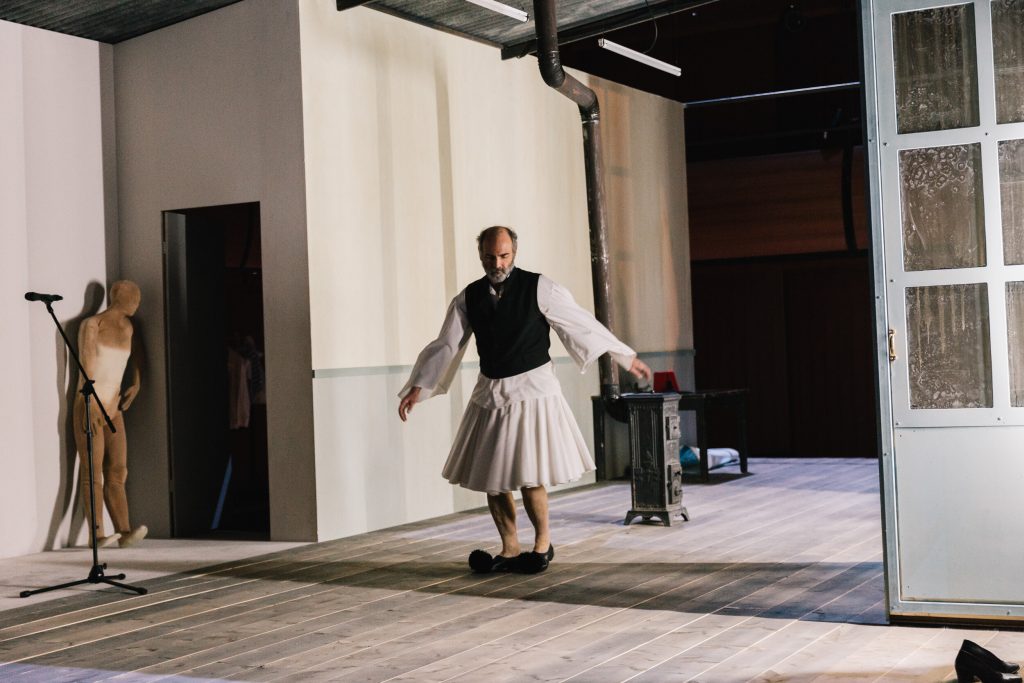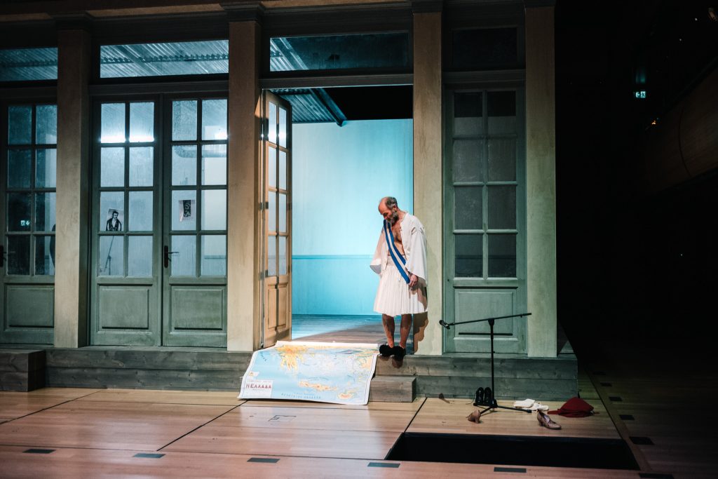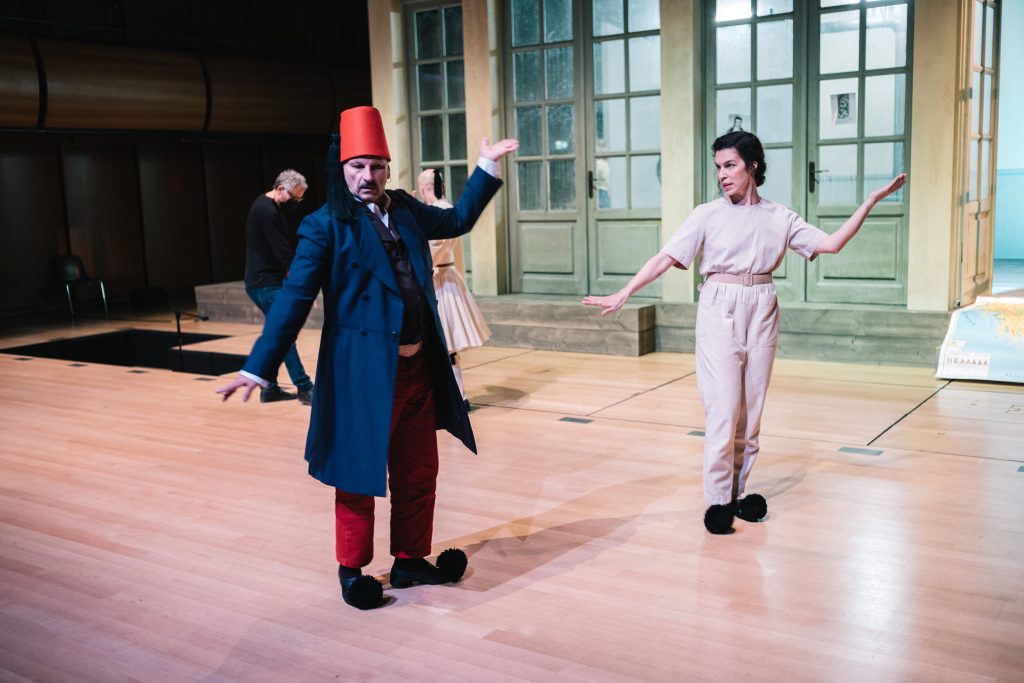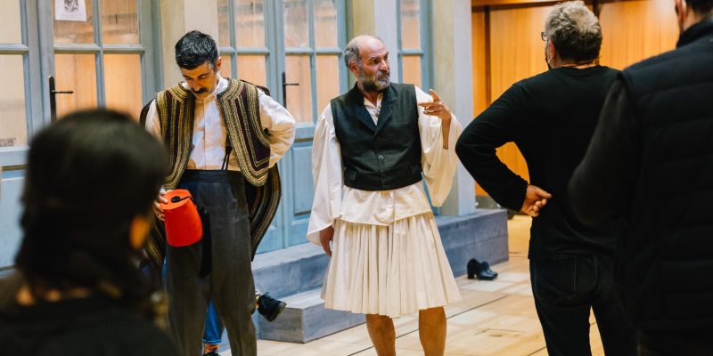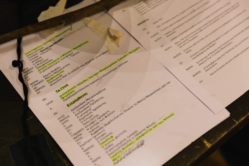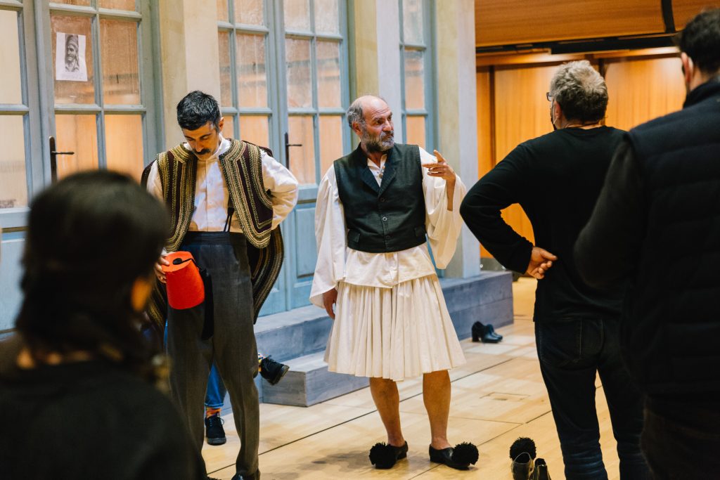 Οι μισές θέσεις της Εναλλακτικής είναι μαζεμένες ώστε η αίθουσα να παραδοθεί στα γυρίσματα, τα μικρόφωνα είναι παντού, στο πίσω μέρος είναι κρεμασμένα τα δεκάδες παραδοσιακά κοστούμια, στο πλάι βρίσκεται ένα γραφείο με βιβλία, γκραβούρες και σημειώσεις με ιστορικές αναφορές, ενώ τα μόνιτορ είναι το σημείο όπου σπεύδουν όλοι για διορθώσεις μετά τα περάσματα των σκηνών. Κάτι σαν θεατρικό VAR που θα κρίνει αν ξεκίνησε στον σωστό χρόνο η αφήγηση και το τραγούδι (τις μουσικές συνέθεσε ο Αντώνης Ανισέγκο), αν ο χορός τήρησε τις αποστάσεις, αν τα πρόσωπα και τα σώματα έχουν απαθανατιστεί από τις σωστές γωνίες, ποιο πλάνο θα βγει με σταθερή κάμερα και ποιο χρειάζεται κινούμενη και ανθρώπινο χέρι.